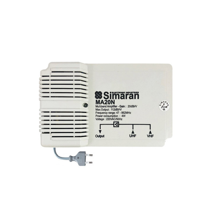 از آمپلی فایر هایی که برای تقویت آنتن مرکزی در ساختمان هایی با تعداد واحد های حداکثر 8 واحد مورد استفاده قرار میگیرد آمپلی فایر سیماران MA20-N می باشد که بدلیل کیفیت بالا و قیمتی مقرون به صرفه توانسته سهم زیادی از بازار را به دست آورد. این تقویت کننده مولتی باند بوده و این به آن معناست که می تواند علاوه بر پشتیبانی از آنتن مرکزی، امکان اتصال سیستم های دوربین مداربسته را نیز داشته باشد. این دستگاه دارای دو ورودی VHF و UHF و یک خروجی می باشد و می تواند فرکانسی از بازه 862-47 MHz را پوشش دهد. حرف MA بیانگر multi band بودن محصول و عدد 20 نیز نشان دهنده بهره آن به دسی بل می باشد.